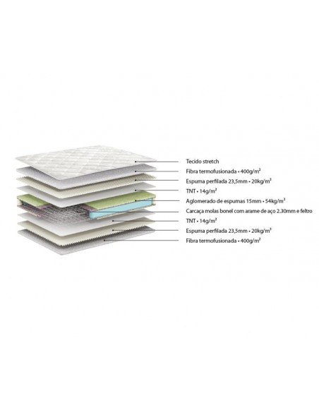 Colchão de molas bonel, com um grau de firmeza médio. Constituído por molas clássicas e três camadas distintas de espuma, oferece melhor ergonomia. Os seus 28cm de altura garantem o conforto necessário para um descanso ótimo.