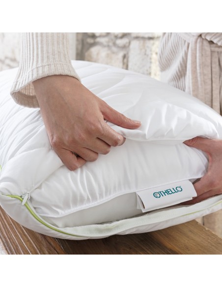 Ao abrir o zíper, pode ver o material de enchimento e aumentar seu conforto com um uso menor, removendo o enchimento de acordo com seu desejo. O tecido exterior é um microtecido óptico branco enriquecido com Aloé Vera.