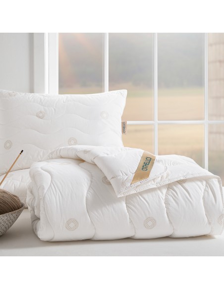 É um edredom fofo, arejado e tangível com 50% lã pura britânica e 50% de enchimento de miçangas HCS. É um produto quente com um grau de aquecimento de 3 em 5. Também pode ser usado facilmente na primavera. O tecido é 100% algodão com recurso Nomite, à prova de fiapos.
