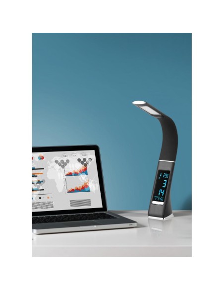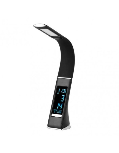 Candeeiro de secretária LED da série BARITA em cor PRETO com detalhes em CHROME. Feito de alumínio e ABS, com um acabamento suave que nos faz lembrar o couro. Design moderno e elegante com linhas simples, ideal para qualquer tipo de estudo, leitura ou mesa de trabalho. DIGITAL, com indicação de DATA, HORA e TEMPERATURA. Tem uma potência de 5 watts, 400 lúmens e uma temperatura de luz de 4000ºK (Branco Natural). Com TRÊS INTENSIDADES LUZES para regular a quantidade de luz desejada de acordo com a actividade a ser realizada, um tipo de lâmpada altamente recomendada para repouso ocular. Os botões estão escondidos na parte de trás da base para preservar a sua estética.