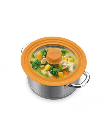 Tampa universal adequada para tachos, panelas e frigideiras TESCOMA ¤ 16, 18 e 20 cm. Fabricada em vidro resistente e silicone resistente ao calor. Pode ir ao forno (max. 200º C).