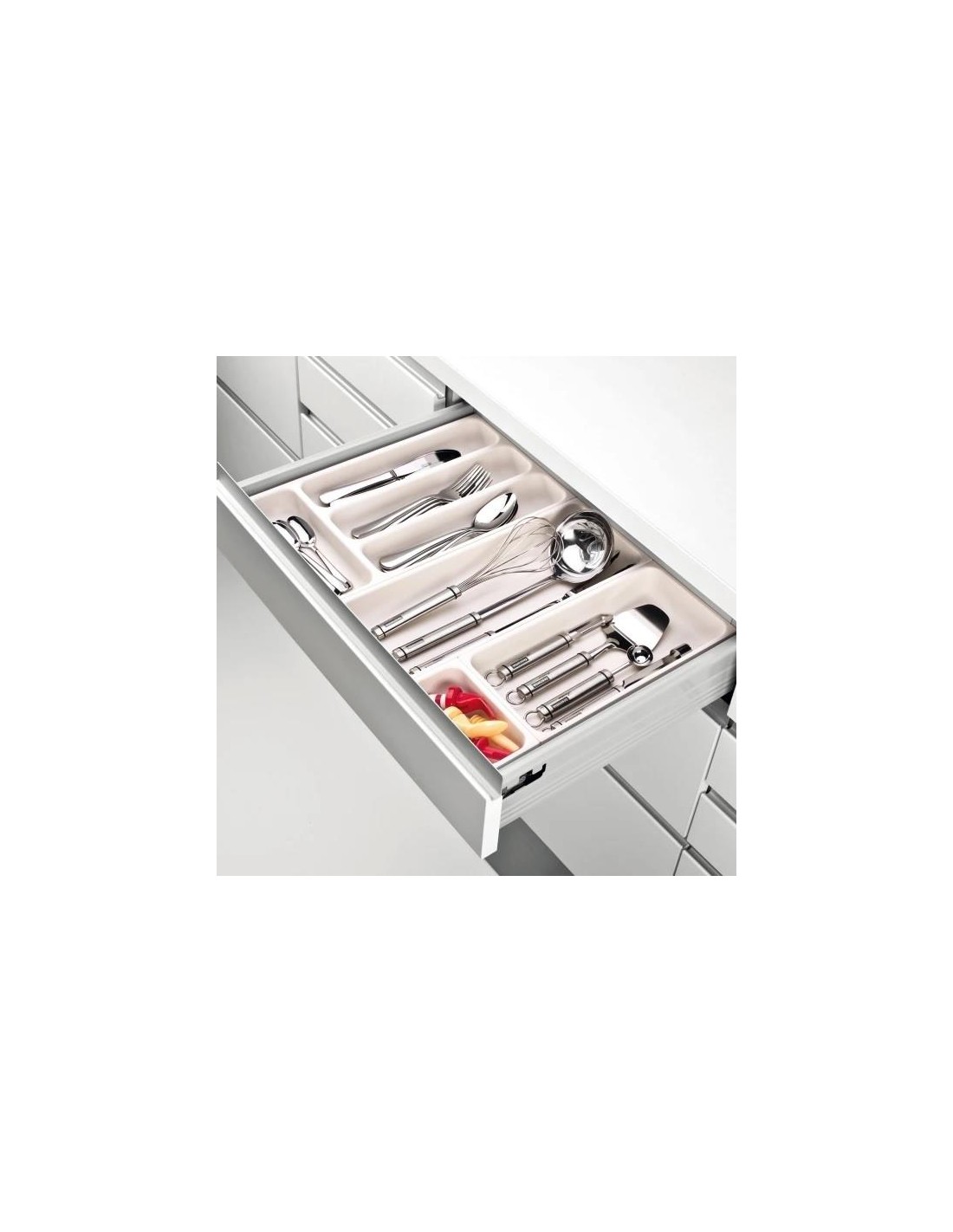 Excelente para de forma organizada guardar talheres. O tabuleiro para talheres pode ser facilmente unido com outros tabuleiros FlexiSPACE para fazer o melhor uso do espaço nas gavetas da cozinha. Fabricado em plástico resistente de excelente qualidade.