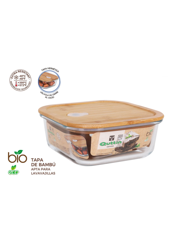 CAIXA VIDRO C/TAMPA BAMBU QUAD. QUTTIN BIO 18.5*18.5CM - QT-BM24938