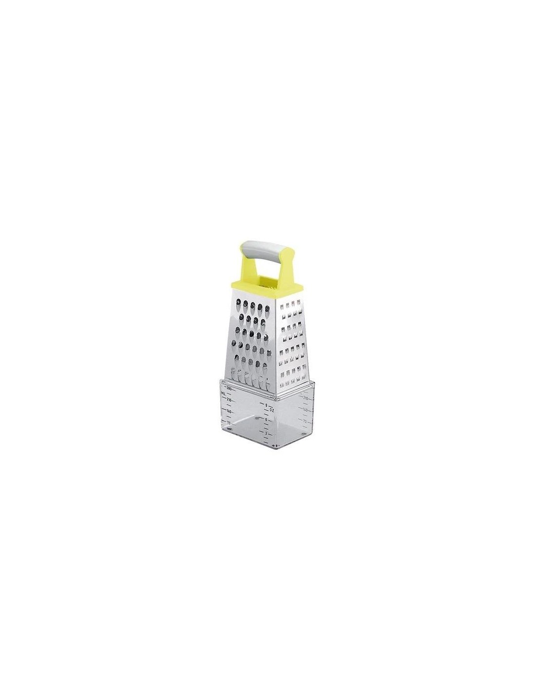 Excelente para facilmente ralar, cortar e medir alimentos. Fabricado em aço inoxidável de excelente qualidade e a pega ergonómica em plástico resistente. O recipiente tem escalas para medir ingredientes e líquidos. Lavar e secar de seguida, pode ir máquina de lavar louça.