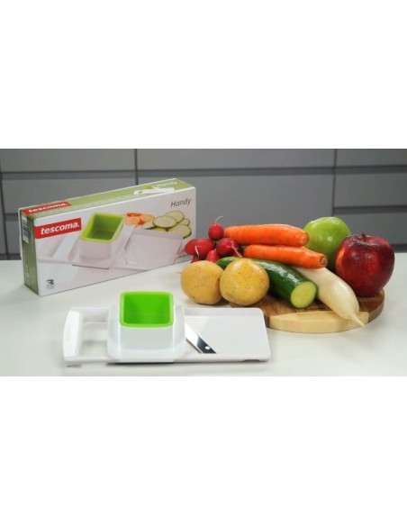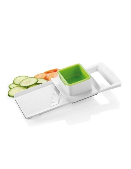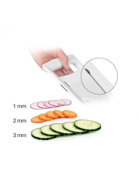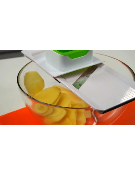Mandolina com espessura de fatia ajustável para 1, 2 e 3 mm, lâmina de aço inoxidável afiada e acabamento antiderrapante.